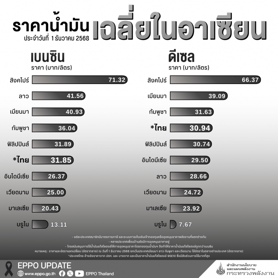 รายงานราคาน้ำมันเฉลี่ยในอาเซียน ประจำวันที่ 1 ธันวาคม 2568 โดยราคาขายน้ำมันแต่ละประเทศ มีปัจจัยทางด้านราคา ดังนี้