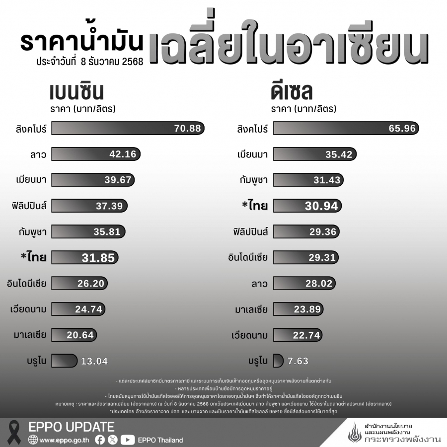 รายงานราคาน้ำมันเฉลี่ยในอาเซียน ประจำวันที่ 8 ธันวาคม 2568 โดยราคาขายน้ำมันแต่ละประเทศ มีปัจจัยทางด้านราคา ดังนี้
