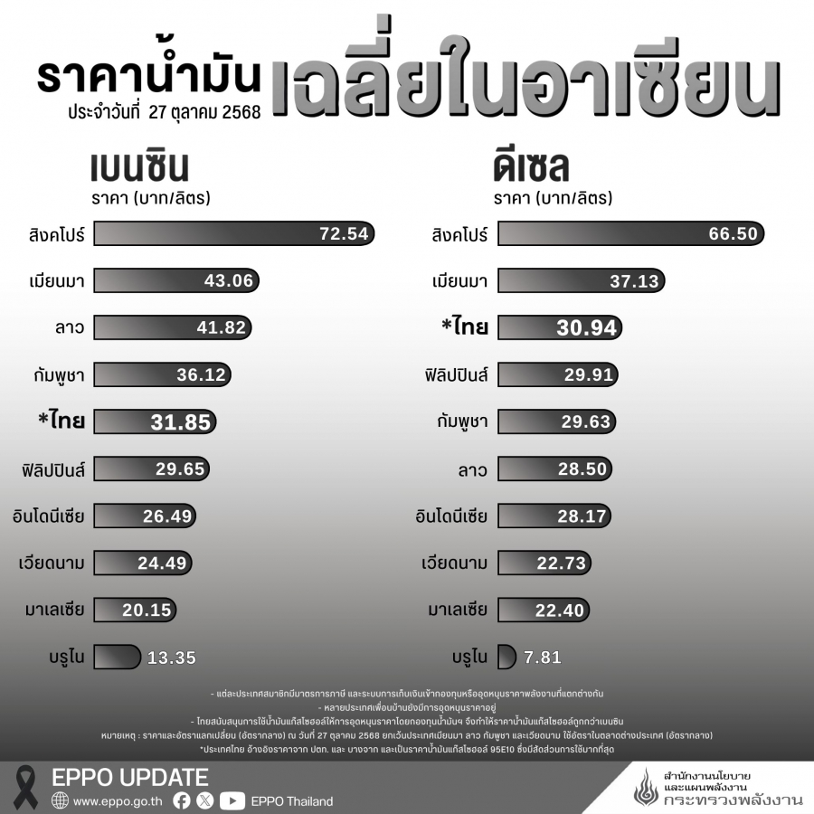 รายงานราคาน้ำมันเฉลี่ยในอาเซียน ประจำวันที่ 27 ตุลาคม 2568 โดยราคาขายน้ำมันแต่ละประเทศ มีปัจจัยทางด้านราคา ดังนี้