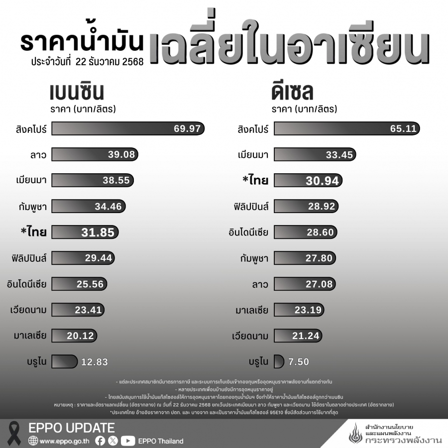 รายงานราคาน้ำมันเฉลี่ยในอาเซียน ประจำวันที่ 22 ธันวาคม 2568 โดยราคาขายน้ำมันแต่ละประเทศ มีปัจจัยทางด้านราคา ดังนี้
