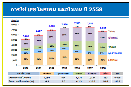 - - LPG, Propane and Butane are used at 6,695 thousand tons decreased by 10.9 percent from the previous year. The share of LPG used as a feedstock in the petrochemical industry is highest. It is about 32 per cent of total consumption. The use of LPG in this sector dropped to 20.6 percent due to the decreasing petrochemical industry and export.